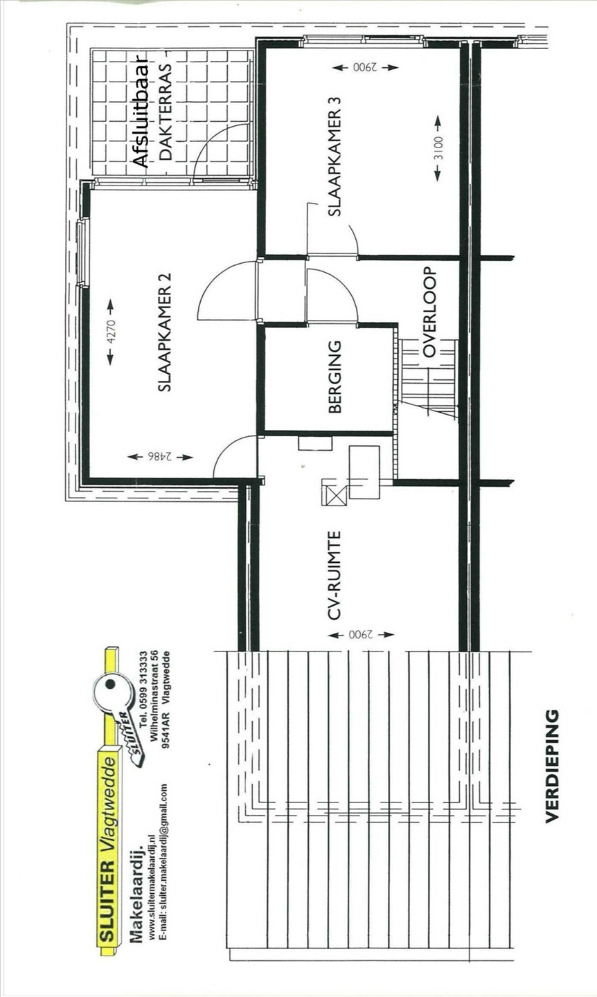 Verdieping: overloop met 2 slaapkamers waarvan een met balkon, 2e badkamer met douche v.w.t. en 2e toilet, zolder/berging cv ruim- te. Tevens is er op de verdieping een wasmachine aansluiting