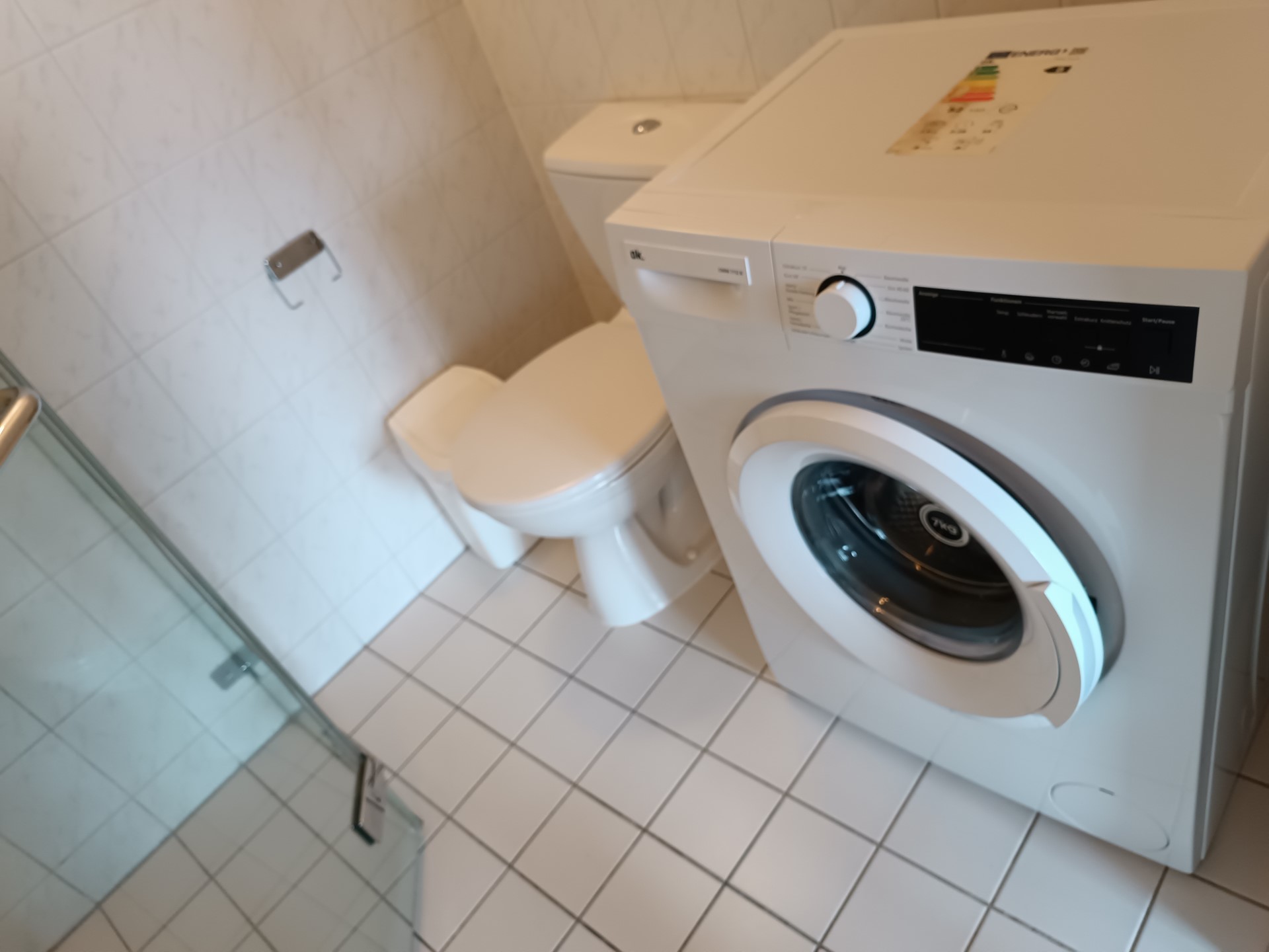 Erster Stock: Flur mit zwei Schlafzimmern, eines davon mit Balkon, einem zweiten Bad mit Dusche und einem zweiten WC, Dachboden/Abstellraum und Zentralheizungsraum. Im ersten Stock befindet sich außerdem ein Waschmaschinenanschluss.